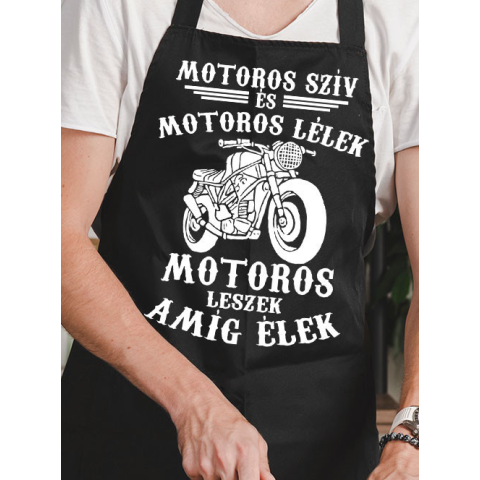 Kötény motorosoknak, motoros kötény a motorok és a sebesség megszállottjainak. Motoros szív és motoros lélek, motoros leszek, amíg élek feliratos kötény. Ütős ajándék barátodnak, családtagodnak is. A kötény fekete és fehér színben is választható. Mérete 6