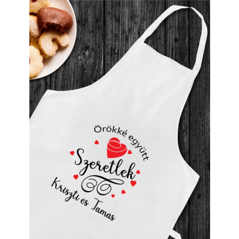Kötény szerelmeseknek, ajándék Valentin napra, évfordulóra. Saját nevetekkel, személyre szóló ajándék a konyha ördögének, vagy konyhatündéreknek. Mérete 66x78 cm, anyag vászon, színe fehér, vagy fekete színben is rendelhető. Egyedi mintával ellátott kö