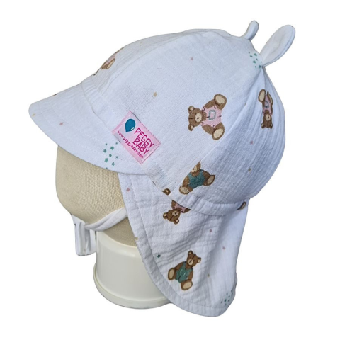 A Peggy Baby megkötős nyári sapka megbízható társ a legmelegebb napokon is. Könnyű, légáteresztő muszlinból készült, belül pedig ugyanezzel a kellemes tapintású, kétrétegű muszlin anyaggal van bélelve, hogy még kényelmesebb