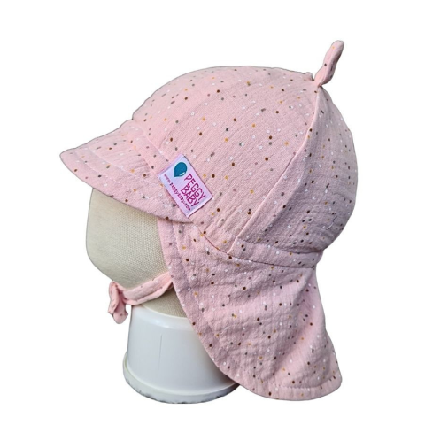 A Peggy Baby megkötős nyári sapka megbízható társ a legmelegebb napokon is. Könnyű, légáteresztő muszlinból készült, belül pedig ugyanezzel a kellemes tapintású, kétrétegű muszlin anyaggal van bélelve, hogy még kényelmesebb