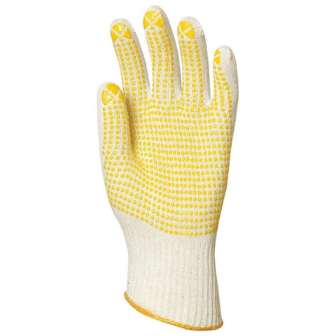 KÖTÖTT DUPLASZÁLAS PAMUTKESZTYŰ, SÁRGA PETTYES TENYÉRREL_9 Fehér. varrás nélküli pamut kesztyű, sárga PVC pöttyökkel a tenyér-részen, 10-es kötésű 4360, 2 szálas, 50g 4365, 2 szálas, 56g Kötött mandzsetta
