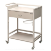 Termék jellemzői: Kötözőkocsi (Műszerállvány) • Fém váz. • A felső és alsó tálcák fémből készültek, három oldalt biztonsági peremmel. • Egy fából készült fiók. • Két edénytartó konzollal. • Négy, 360 fokban forgó kerék. • Elektrosztatikus porfestéssel bev