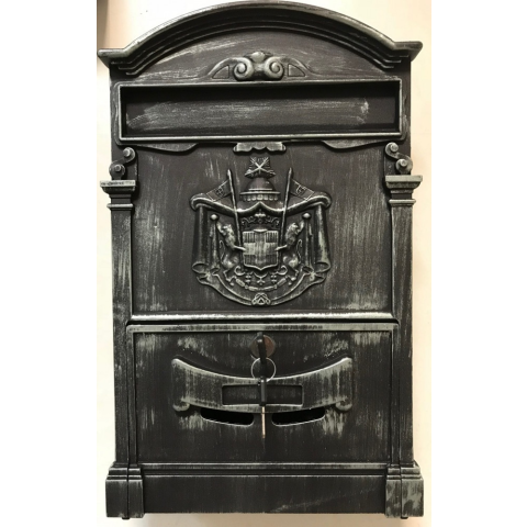 Kovácsoltvas postaláda fekete-ezüst antik színben - külső nyithatósággal Kovácsoltvas jellegű postaláda FEKETE/EZÜST ANTIK színben, korrózióálló. Anyaga: Aluminium Szín: fekete - ezüst antik (szinterezett) Magasság: 41 cm Szélesség: 25,5 cm Méret: 415 x