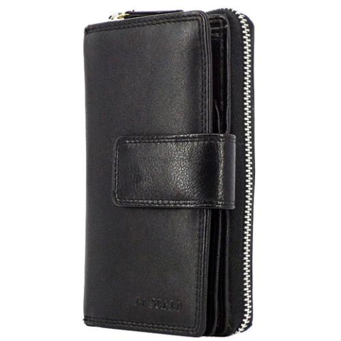 Közepes méretű, sokrekeszes cipzáros fekete női bőr pénztárca
