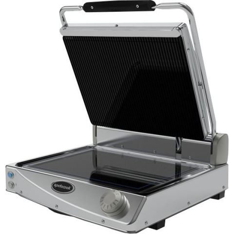 Professzionális SpidoCook kontakt grill dupla, bordázott üvegkerámia sütőfelülettel. Az SHB™ Plus technológiának köszönhetően rendkívül gyorsan felmelegszik, így ideális szendvicsek, húsok és zöldségek sütéséhez.