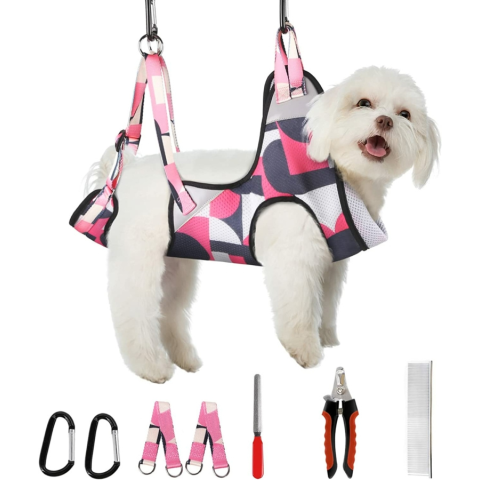 1 kép Kozmetikai függőágy kutyáknak körömvágó csipesszel, fésűvel, körömreszelővel, rózsaszín mintás