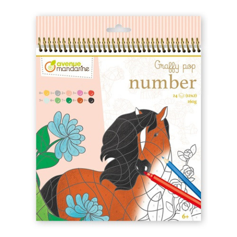 Kreatív számos kifestő füzet Avenue Mandarine Lovak Számos kreatív színező 20x25,5 cm Spirálos 24 mintával (12x2 lap) Minden szám egy színhez rendelt Ideális finommotorika képességfejlesztéshez és a színharmónia tudatos elsajátításához.