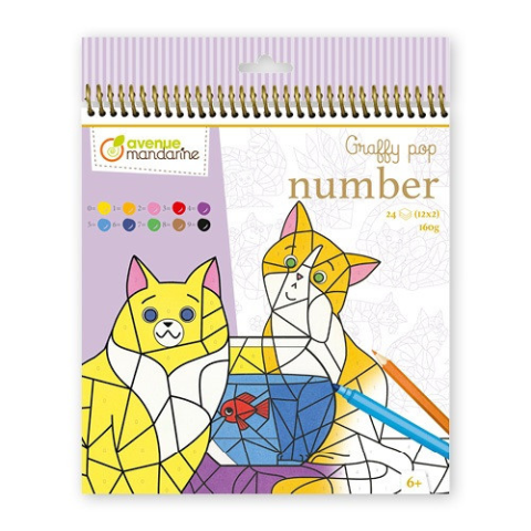Kreatív számos kifestő füzet Avenue Mandarine Graffy pop Macskák Számos kreatív színező 20x25,5 cm Spirálos 24 mintával (12x2 lap) Minden szám egy színhez rendelt Ideális finommotorika képességfejlesztéshez és a színharmónia tudatos elsajátításá