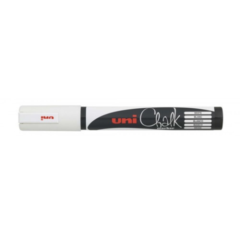 Krétamarker Uni PWE-5M fehér vízbázisú krétamarkerszáradás után vízálló, de nedves törlőkendővel könnyen eltávolíthatóüvegen, sima, nem porózusos felületeken, világító táblán, fluo színeivel figyelemfelhívó írás, rajzolat készíthetőírásvastagság: 1,8 m