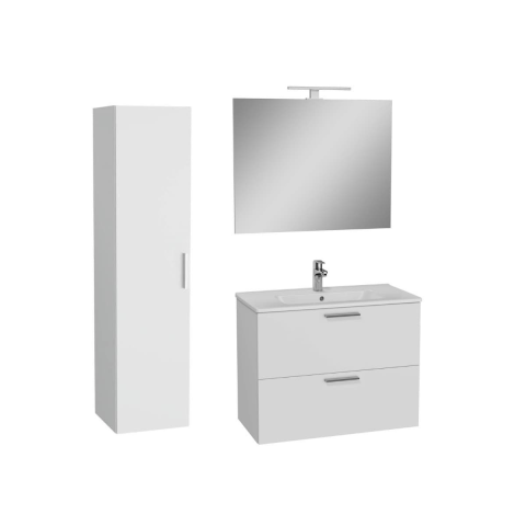 Függesztett fürdőszoba szett fehér kivitelben, kerámia mosdóval. A mosdós szekrény szélessége 80 cm.
