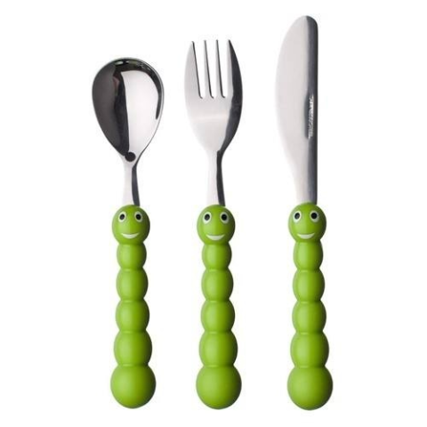 Háromrészes CATERPILLAR gyermek evőeszköz készlet kukacdizájnos műanyag nyéllel.