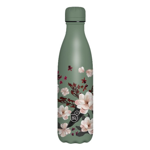 Kulacs duplafalú ARS UNA fém 500 ml Flowery Pink BPA, BPS, BPF mentes, élelmiszerbiztos 304SS rozsdamentes acélból készült duplafalú fémkulacs, Food Safe minősítéssel. A kupak belsejében lévő BPA mentes szilikon tömítés garantálja a csepegésmentes záró