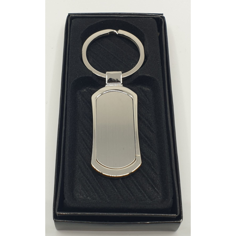 Gravírozható kulcstartó. Téglalap alakú gravírozható kulcstartó, fekete papír dobozban.
