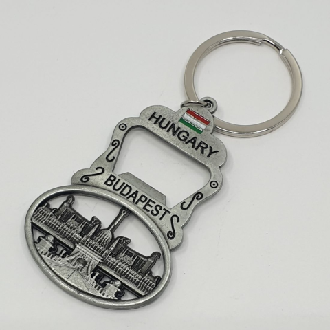 Hungary, Budapest feliratú kulcstartó és sörbontó. Hungary, Budapest felíratú fém kulcstartó és sörbontó, Budapest nevezetességei motívummal.