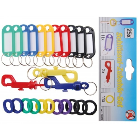 Zöld, kék, sárga, piros és fekete színek A készlet tartalma: - 3 db fekete, 2 db piros, 2 db sárga, 2 db kék és 2 db zöld kulcstartó írható címkével - 1 db sárga, 1 db kék és 1 db piros karabiner - 3 db fekete, 2 db lila, 2 db sárga, 2 db kék és 2 db