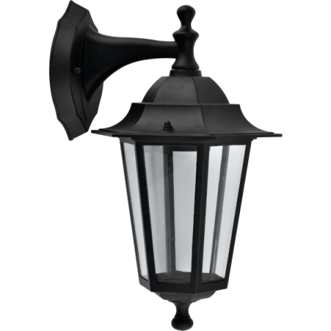 Kültéri falikar fekete színben, lefelé álló. Anyag: alumínium ház+átlátszó üveg, 1xE27 foglalat (fényforrás nélkül), 220-240V ~, 50Hz, IP44.