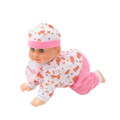 Ez a játékbaba rengeteg örömforrást okozhat a kicsinek, mivel amellett, hogy bekapcsolás után elkezd előrefelé mászni, közben aranyos hangon beszél, nevet és énekel is. A bekapcsológomb a mellkasán található a ruhája alatt, mellyel automatikusan elkezdi a