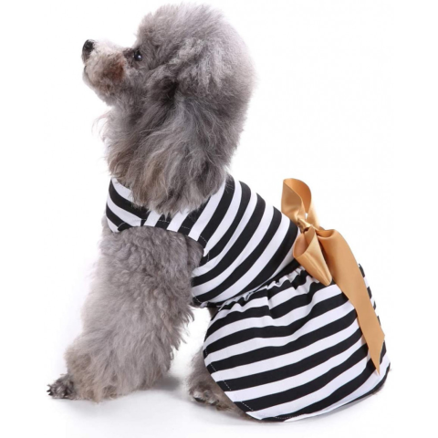 1 kép Kutyaruha - Elegáns és könnyű fekete/fehér csíkos ruha arany színű masnival - M