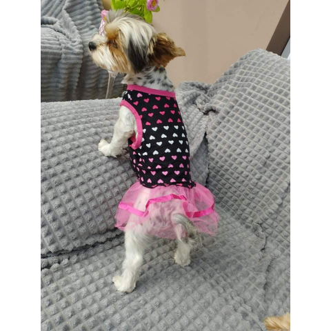 1 kép Kutyaruha - Nyári kutyaruha, fekete alapon, rózsaszín szíves mintával és tüll szoknyarésszel - S