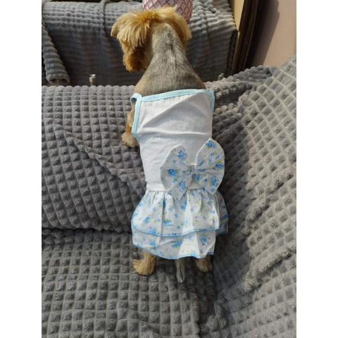 1 kép Kutyaruha - Spagettipántos könnyed ruha fehér/kék virágos színben, masnival - XS