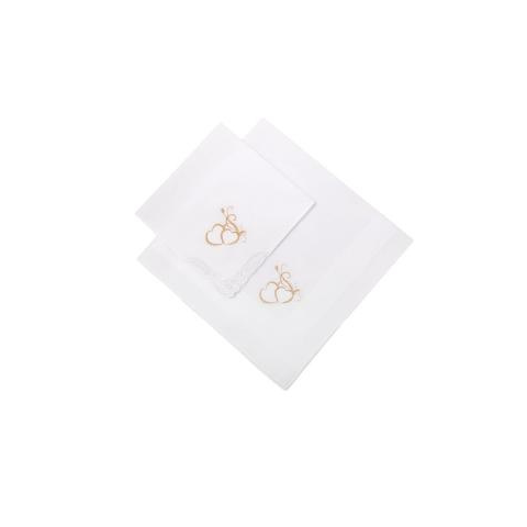 L23-1 női esküvői vagy eljegyzési textilzsebkendő (hímzett szív motívum, arany) Anyag: 100% pamut Méret: kb. 28 x 28 cm Mennyiség: 1 db / tasak Színek és minták: fehér alapon arany színű hímzett szív minta Szegély: csipkés Ez a k