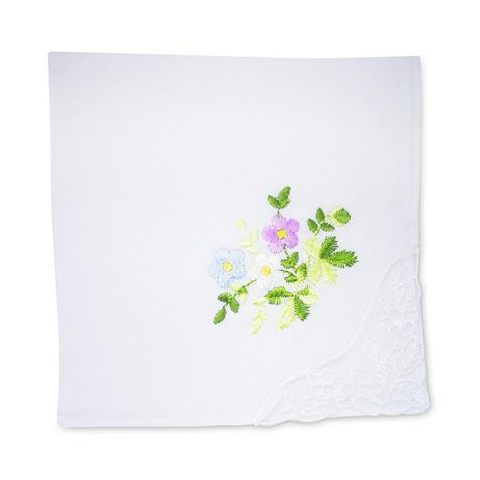 L28-3 hímzett női textilzsebkendő csipkés szegéllyel Anyag: 100% pamut Méret: kb. 28 x 28 cm Mennyiség: 1 db / tasak Színek és minták: fehér alapon színes hímzett virágminta Különleges, hímzett textilzsebkendő elegáns csipke szeg