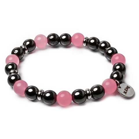 RUGALMAS KARKÖTŐ, a mérete választható.Az ékszer ásványai és tartozékai:– 8 mm-es fekete hematit gyöngyök– 8 mm-es pink jade gyöngyök– Ezüst színű díszek– M.King márkajelzésű nemesacél logóbiléta.– Technika: rugalmas,