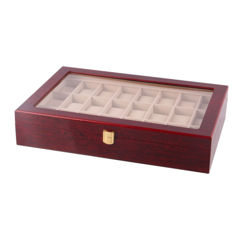 Lakkozott cseresznye színű fa óratartó, óradoboz 24 óra számára. Arany színű zsanérok, belseje világos színű mikroplüss. Külső méretei: Szélesség: 47,5cm Mélység: 30cm Magasság: 9cm Fakk mérete: Szélesség: 50mm