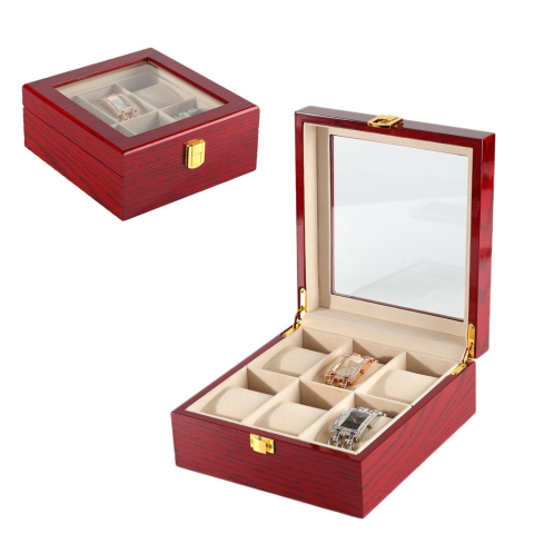 Lakkozott cseresznye színű fa óratartó, óradoboz 6 óra számára. Arany színű zsanérok, belseje világos színű mikroplüss. Külső méretei: Szélesség: 21cm Mélység: 21cm Magasság: 9cm Fakk mérete: Szélesség: 55mm Mélység: 90mm Magasság: 80mm