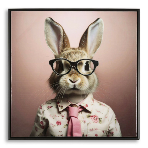 Nyúl nyakkendőben - Falikép modern keretben 62,5x62,5 cm Ez a bájos falikép egy elegáns, nyakkendős nyulat ábrázol, ami vidámságot és egyedi stílust visz otthonába. A kép tökéletes választás modern és rusztikus enteriőrökbe egyaránt. Jellemzők: Mér...