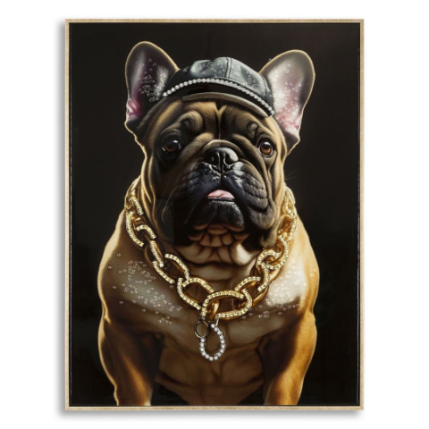 Franciabuldogos falikép arany kerettel - 62x82 cm Ez a lenyűgöző falikép egy vagány franciabuldogot ábrázol aranylánccal és bőr sapkával, a 90-es évek rap kultúrájának stílusát idézve. A kép prémium minőségű vászonra készült, és egy elegáns arany fém...
