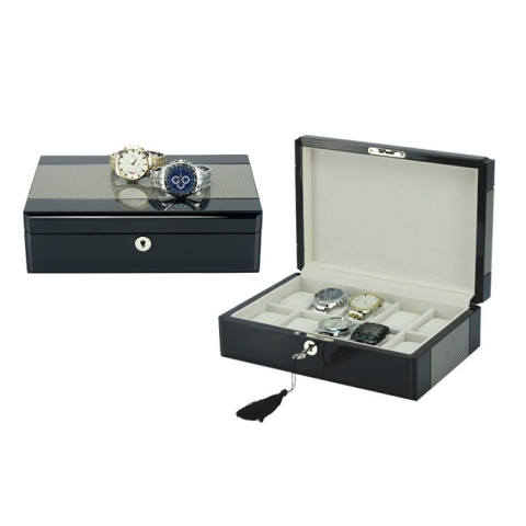 Lakkozott fekete/karbon színű fa óratartó doboz 10 órához. Gyönyörű óratartó doboz igazi fából! Belseje plüss, világos színű! Zárható, 1db kulcs tartozék! Külső méretei: 295mm széles 200mm mély 85mm magas Fakkok mérete: 47mm széles 80mm mély 80mm magas