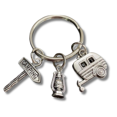 Praktikus és stílusos lakókocsis kulcstartó három egyedi medállal, tökéletes ajándék túrázóknak és lakóautósoknak