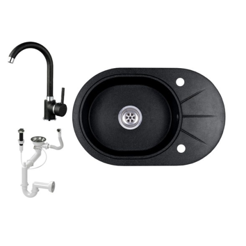 Laneo ZIA gránit mosogató szett fekete színben. Teljes készlet, ami tartalmazza a magasított csaptelepet, a beépített mosogatószer adagolót és a szifon készletet. Ovális kialakítású, egyedi megjelenésű mosogató, méretes, 44,5 x 37 cm-es medencével, ami 19