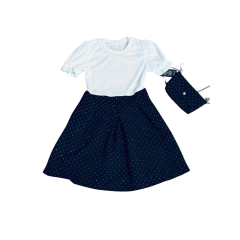 Kislány elegáns szett köves díszítéssel és táskával Ez a különleges összeállítás igazi ünnepi viselet! A fodros ujjú, fehér felső tökéletesen harmonizál a fekete, apró csillogó kövekkel díszített szoknyával. A szetthez egy st