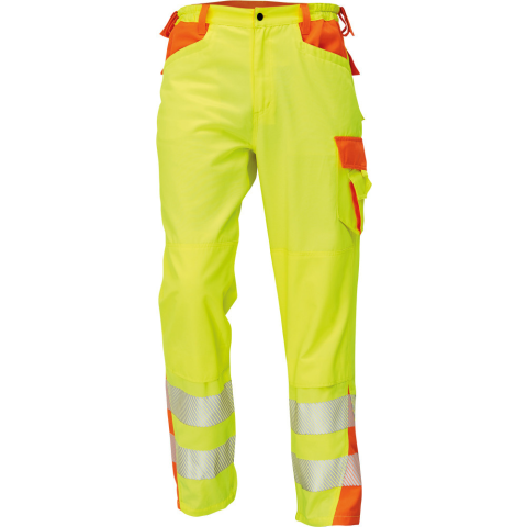 LATTON nadrág sárga/narancssárga 48 • férfi nadrág két attraktív jólláthatósági szín kombinációjában fényvisszavető csíkkal • 2 nagy első zsebbel • 2 multifunkcionális oldalzseb • 2 hátsó zsebfedős zsebbel • rugalmas derékpánt • kalapácstartó
