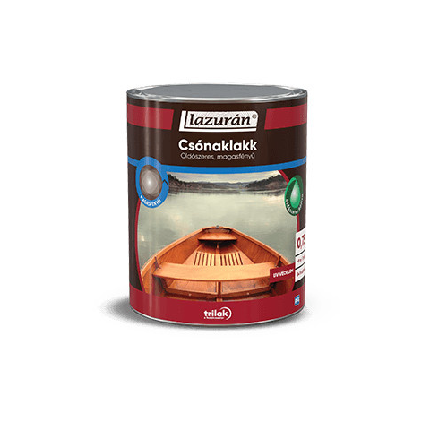 LAZURÁN CSÓNAKLAKK- OLDÓSZERES MAGASFÉNYŰ - 0,75L Oldószeres, magasfényű lakk. Csónakok, fából készült vízbe merülő szerkezetek lakkozására alkalmazható. Alkalmas poliészter anyagú csónakok védelmére is. Kitűnően használható belső térben lévő fafelületekr