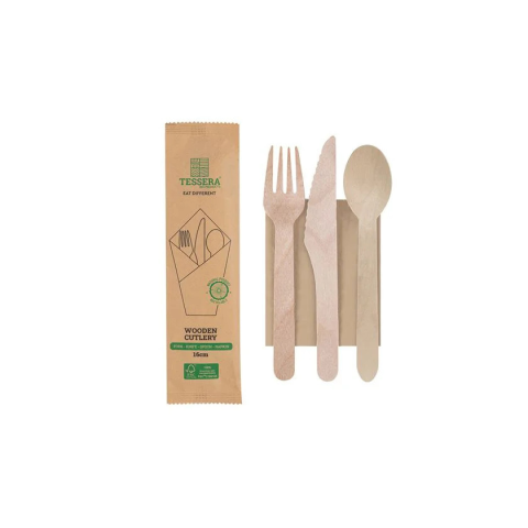 Kiszerelés: 500 db / karton 5 csomag/karton 100 db/csomag Méret: 16cm Összetétel: Fa / papír Masszív lebomló evőeszközkészlet. Tartalma: kés, villa, kanál és szalvéta, matt kraftpapír csomagolásban. A szalvéta fehérítetlen, újrahasznosított papírból, a