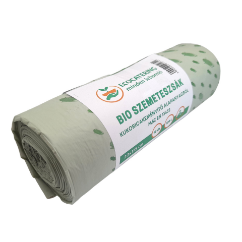Környezetbarát, biológiai úton lebomló, megújuló erőforrásból származó (kukoricakeményítőből készült) PLA szemeteszsák. Kiszerelés: 30 tekercs/karton 10 db/tekercs Méretek: 120l, 730x1150 mm/zacskó Vastagság: 25 mikron Összetétel: PLA Iparilag komposz