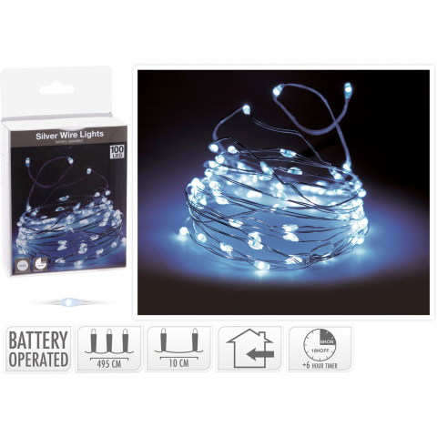 Ez az ezüstszínű drótból és 100 hidegfehér LED-ből (melyek közül 20 különleges villogó effektusra képes) álló LED-es fényfüzér tökéletes választás a hangulatos beltéri világításhoz, és nem csak karácsonykor. A vékony, hajlékony kábelnek köszönhetően a fényfüzér barkácsoláshoz is kiválóan alkalmas. Ráadásul elemmel működik, így rendkívül rugalmasan használható. A LED-es fényfüzér beépített időzítő funkcióval is rendelkezik, amely 6 óra