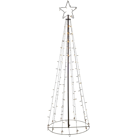 A LED-es karácsonyfa világítás az adventi és karácsonyi időszak dekorációs eleme. A figurát elhelyezheti a kertben vagy a bejáratnál, így az hangulatos környezetet teremt. A karcsú piramis alakját feszes fényfüzérek alkotják, közepén egy tartóoszloppal. Csúcsát egy ötágú világító csillag díszíti. A karácsonyi világítás 180 cm magas, alsó része pedig maximum 60 cm átmérőjű. A filigrán alkotás fekete köracélból és drótból készült. Az anyag időj