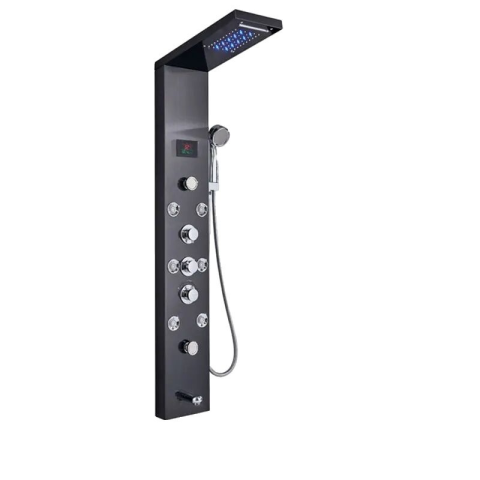 Luxus LED-es Fekete Zuhanypanel Digitális Kijelzővel - Élvezze a tökéletes zuhanyélményt! 🚿 Ez a stílusos és modern zuhanypanel a fürdőszobája központi eleme lesz. A digitális kijelzőnek, a LED világításnak és a masszázsfunkcióknak köszönhetően minde...