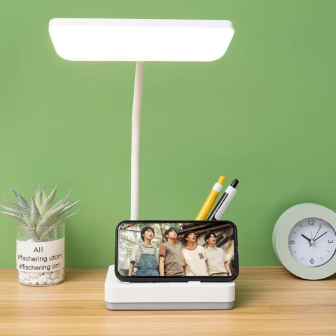 LED hordozható olvasólámpa tolltartóval és telefontartóval A LED asztali lámpa ideális választás lehet mindenki számára, aki keres egy modern, energiatakarékos és funkcionális megoldást. Elegendő fényt biztosít akár olvasáshoz, akár íráshoz, vagy akár