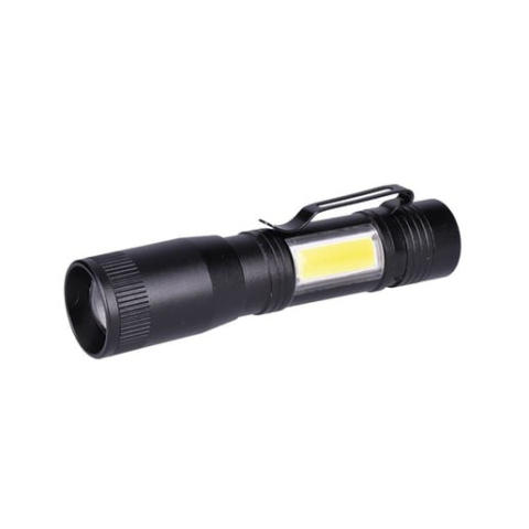 LED fém zseblámpa, 150 + 60lm, 3W + COB, AA, fekete