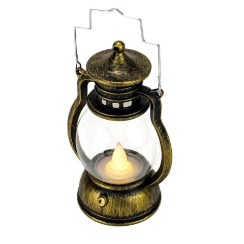 Koptatott fém hatású, műanyag világító elemes lámpás. A lámpás használható önmagában, vagy koszorúkra és díszekre, kegyeleti dekorációkhoz. Akasztó füllel ellátott, és teljesen ellenáll az időjárási viszontagságoknak. A lámpásokban az elem tartozékként megtalálható.