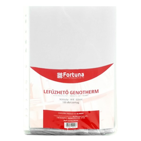 Lefűzhető genotherm FORTUNA A/4 60 mikron víztiszta 100 darabos Víztiszta felületű genotherm a gyakran használt a dokumentumok tárolására.