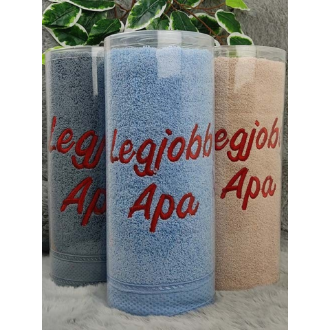 Legjobb apa hímzett törölköző, ajándék apáknak. Legjobb apa feliratos törölköző, Apák napjára, születésnapra, névnapra, ajándék ötlet férfiaknak. Puha, 100 % pamut törölköző, mérete 70 x 140 cm. Műanyag henger csomagolásban szállítjuk. 70x140 cm-es mér