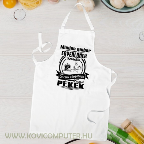 Legjobb pék kötény, ajándék pékeknek. Minden ember egyenlőnek születik, de csak a legjobbak lesznek pékek felirattal. Ha Te is pék lettél, akkor ezt a kötényt Neked találtuk ki. A kötény fekete színben is rendelhető, anyaga vászon, mérete 66x78 cm (széles
