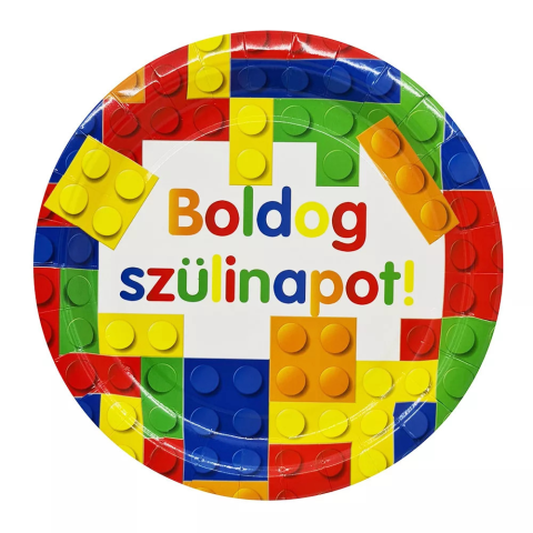 A színes legó mintás papír tányér. Anyaga: papír A papír tányér mérete: 23 cm átmérő A csomagban 6 darab azonos mintájú tányér található. A hozzá tartozó pohárral,szalvétával és csákóval fokozhatod a buli hangulatát.
