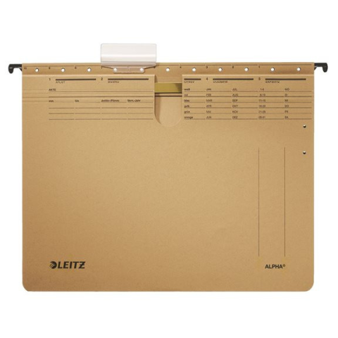 Függőmappa, gyorsfűzős, karton, A4, LEITZ Alpha, natúr - minőségi függőmappa gyorsfűzős szerkezettel lyukasztott dokumentumok számára - mindennapi használatra alkalmas - a nagy méretű, erős, műanyag címketartóra akár 4 sorban is írhatunk - erős és tar